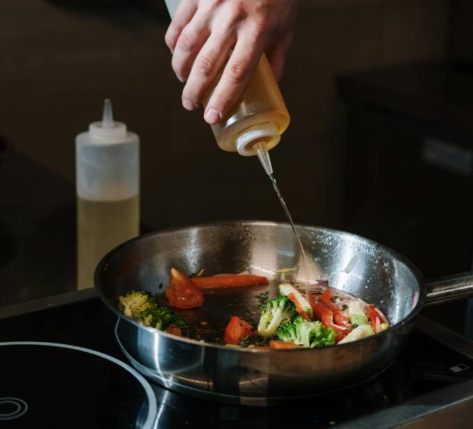 Yes, we cook with it. We sauté, we roast, we even fry. But we’re mindful. We use medium heat more often than high heat. And here’s something important I teach at my tastings: warm your olive oil gently in the pan — don’t throw it onto an already screaming-hot surface. Add the oil to a cool or warm pan, let it heat gradually with the pan, then add your food. This prevents thermal shock and keeps the oil stable.